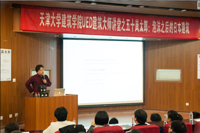 第一场五十岚先生在天津大学讲座的主题是"泡沫之后的日本建筑"。他以时间为脉络,从当时历史、经济、文化的角度解读日本自二十世纪五十年代至今的日本建筑发展历程。
