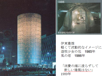 第二部分,五十岚先生着重介绍了日本泡沫经济时期以及后期,日本建筑的兴起和衰落以及建筑风格的转变。不仅深度剖析了著名建筑师伊东丰雄以及隈研吾的思想以及作品风格怎样经历并顺利度过了从后现代主义到现代主义的回归,而且从建筑评论家和地产开发商的方面阐述了这一时期日本建筑向理性现实风格的转变。